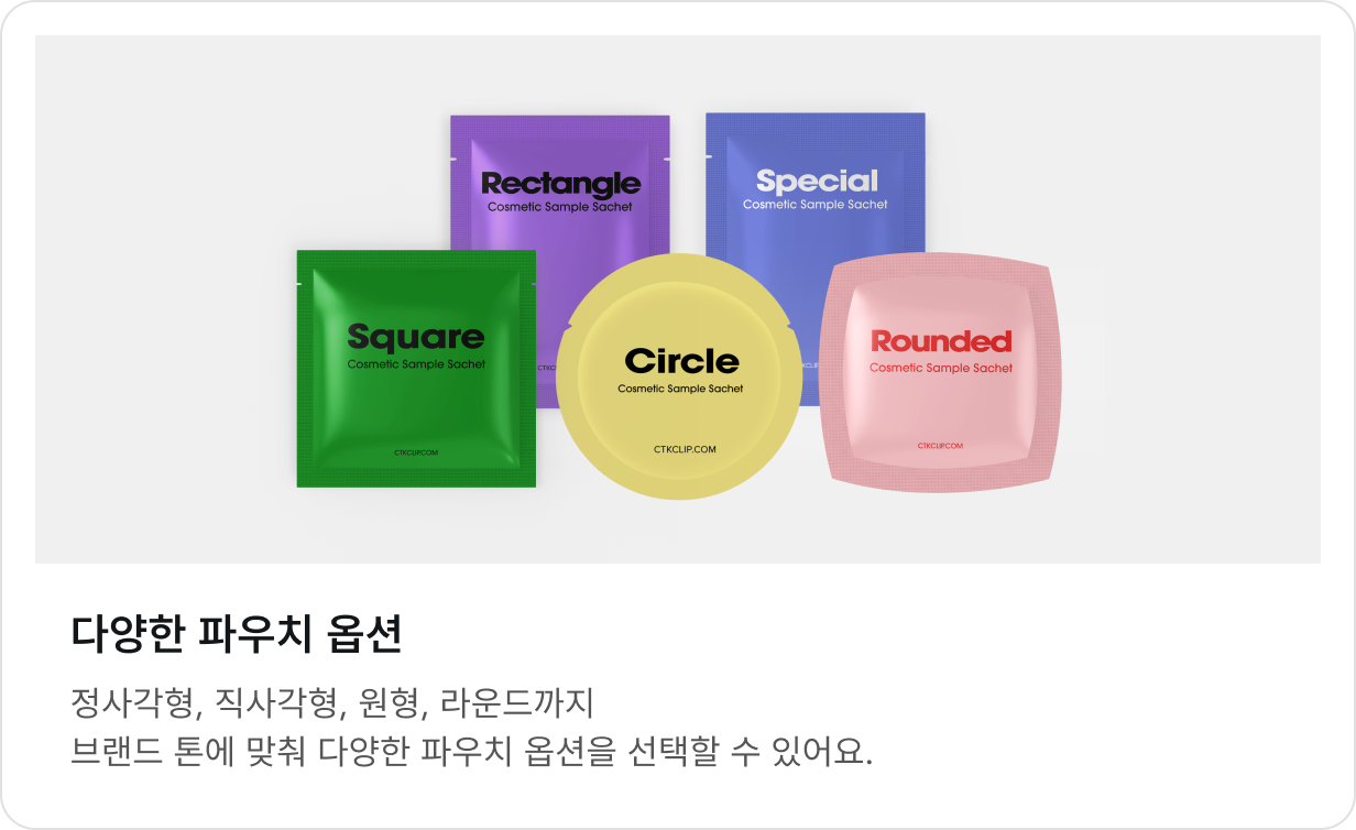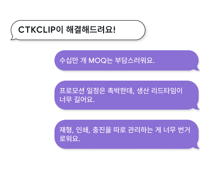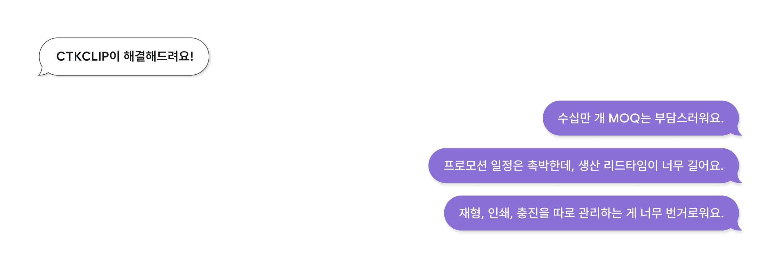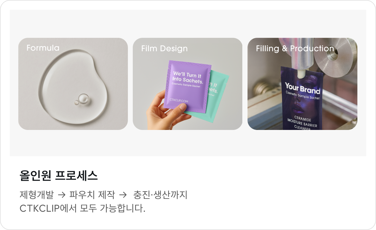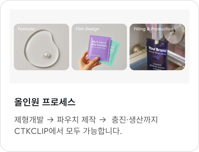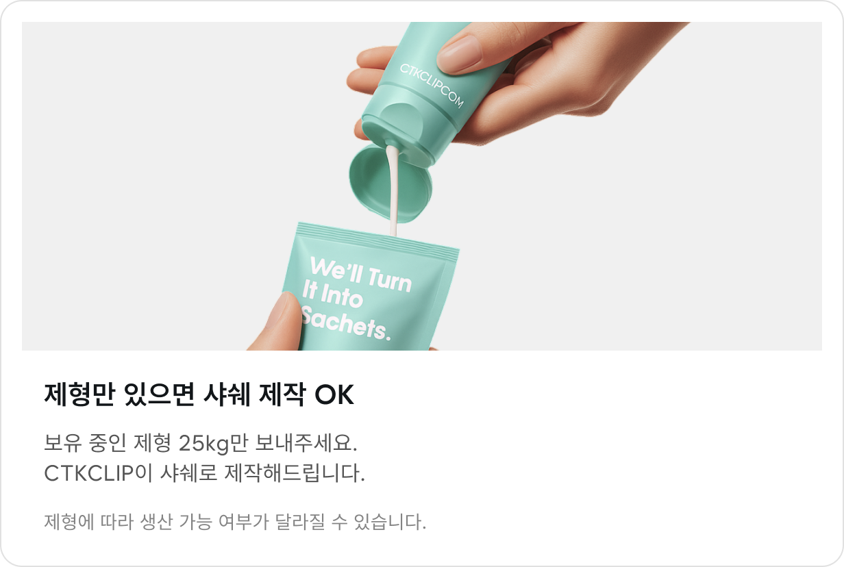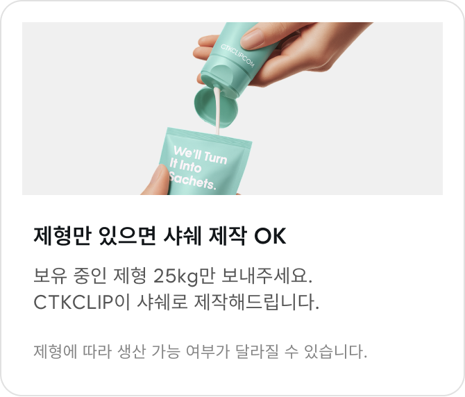 샤쉐는 단위당 제형 사용량이 적어 본품과 병행 제작 시 생산 효율과 확장성이 높아집니다. 또한 여러 업체와 따로 소통할 필요 없이 CTKCLIP에서 통합 관리하므로 시간과 커뮤니케이션 부담을 줄일 수 있습니다.